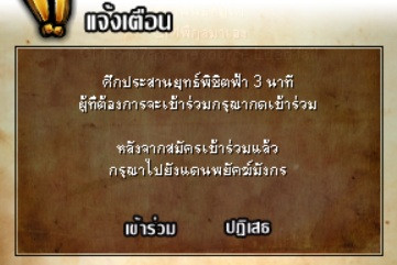 หากกดเข้าร่วมใน Pop up ไม่ทันสามารถสมัครเข้าร่วมได้ที่ NPC ชอนอู หัวข้อ ขอข้อร่วมประลอง PK ได้ จากนั้นจะต้องเข้า รอหน้าต่างแจ้งเตือนเข้าการประลองจะเริ่มในอีก 1 นาที เพื่อทำการเคลื่อนย้ายตัวละครไปแดนพยัคฆ์